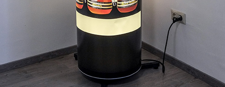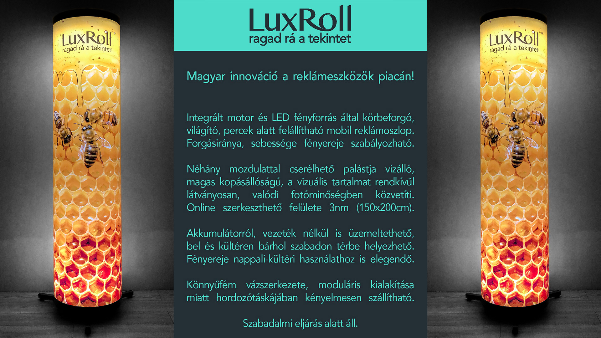 Helytakarékos, körbejárható. Akár 50x50cm alapterületen felállítható, a 150x200cm méretű vizuális tartalom minden irányból egyformán jól látható